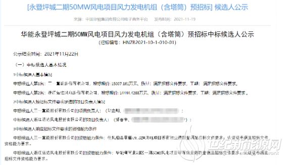 近日,華能永登坪城二期50MW風(fēng)電項目風(fēng)力發(fā)電機組(含塔筒)預(yù)招標(biāo)中標(biāo)候選人公示,三一重能預(yù)中標(biāo)50MW,投標(biāo)報價15007.161萬元,折合單價3001元/kW(含塔筒)。